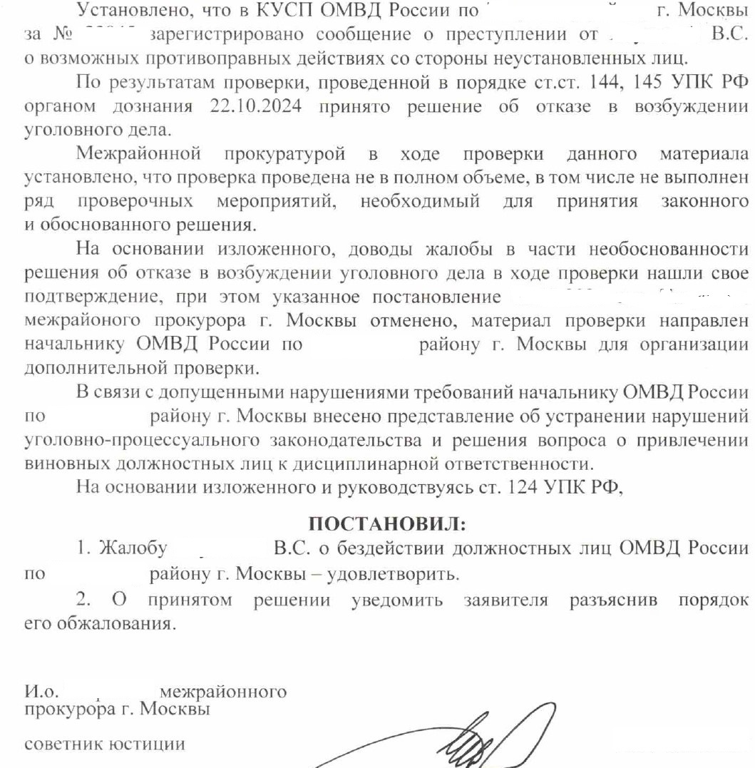 Второе постановление вновь было успешно обжаловано межрайонному прокурору и было им отменено с направлением на новую дополнительную проверку. После повторной отмены постановления прокурором, ОВД района ЦАО решило переосмыслить обстоятельства правонарушения и, не усмотрев своей территориальной подследственности, передало материалы проверки в ОВД одного из районов ЮЗАО г.Москвы. По прошествии еще 10 месяцев проверки, ОВД района ЮЗАО сообщило о вынесении нового постановления об отказе в возбуждении уголовного дела.