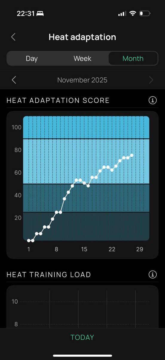 Сначала думала, что акклиматизация должна быть мучительна, но нет, все можно делать (в моем случае) очень мягко. Видимо именно поэтому я проще многих акклиматизируюсь к жаре. И без лишней одежды я при нагрузке нагреваюсь до требуемой для акклиматизации температуры.