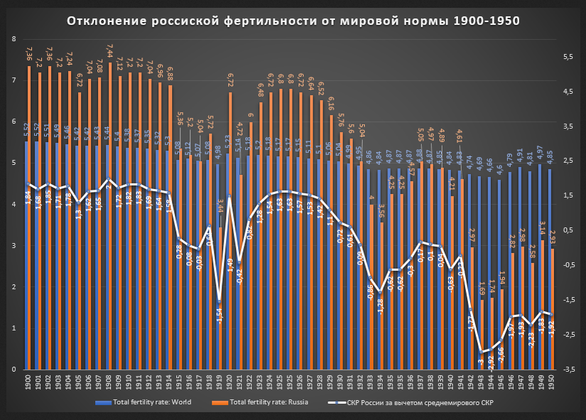 Когда этот нехороший человек заявляет: «К концу правления Хрущева российская фертильность рухнула на 3 ребенка, ниже среднемирового уровня. Русский народ в 1964, рожал как в военном 1943 году под Сталинградом.», он нагло врёт. И дело тут даже не в манипулятивном образе родов под Сталинградом. Очевидно, что большинство детей родились в других местах. В том числе и в очень глубоком тылу. Правда заключается в том, что он опять подменяет рождаемость в стране разницей со среднемировой. Рождаемость в СССР в 1943-м была 1,69, а в 1963-м (похоже, он спутал данные за 63-й и 64-й) — 2,29. Так что, в 64-м русские рожали совсем не так, как в 43-м. Это просто ложь.