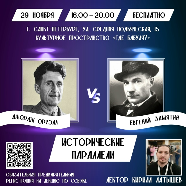 Наш автор, Кирилл Латышев, приглашает вас на свою лекцию в Санкт-Петербурге про Евгения Замятина и Джорджа Оруэлла! Пройдёт она 29 ноября 2025, по адресу Санкт-Петербург, ул. Средняя Подьяческая, 15. Пространство «Где Бабуля?». Лекция полностью бесплатная, по предварительной записи, количество мест ограничено, их осталось всего 18 (с некоторым усилием можно впихнуть сверху 5-6 котанов). Лекция пройдёт с 16 до 20 ч. Что ожидается? История жизни двух великих авторов антиутопий, их судьбы и творчества. Мы будем делать акцент на историческое время, говорить о том, что привело их к главным трудам, обессмертивших имя и кем вообще были эти великие писатели. Джордж Оруэлл — «классик, которого никто не читает». Мы покажем его не только как писателя, но и как политического деятеля с тяжелой жизнью и непонятым окружением, выйдя за рамки моей 14-частной лекции по его истории. Евгений Замятин — человек своего времени и вне его одновременно. Русский публицист и старый большевик, известный больше как