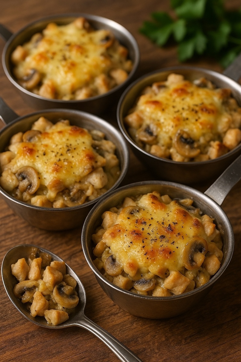 Блюдо простое в приготовлении, но невероятно вкусное и ароматное 😋 Ингредиенты: * куриная грудка – 500 г * шампиньоны свежие – 250–300 г * репчатый лук – 1 шт. * сливки 10–20 % – 1 стакан * растительное масло – 2 ст. л. * сливочное масло – 50 г * твёрдый сыр – 120–150 г * соль, молотый чёрный перец – по вкусу * сушёный базилик – 0,5 ч. л. Приготовление: 1. Лук очистить и нарезать мелкими кубиками. 2. Грибы промыть, обсушить и нарезать ломтиками. 3. Куриное филе разрезать вдоль, затем нарезать небольшими брусочками. 4. В сковороде разогреть растительное масло, обжарить лук до прозрачности, затем добавить шампиньоны. Готовить до полного выпаривания жидкости (примерно 15 минут). Приправить солью и перцем. 5. На другой сковороде растопить сливочное масло, выложить курицу и обжарить около 10 минут, посолить, поперчить, добавить базилик. 6. Соединить курицу с грибами и луком, влить сливки, прогреть 2–3 минуты. 7. Разложить смесь по формочкам для жульена, посыпать натёртым сыром. Зап