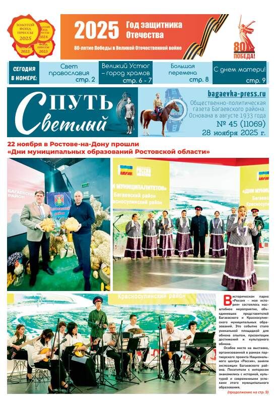 СВЕТ ПРАВОСЛАВИЯ. 4 декабря — память Введения во храм Пресвятой Богородицы — стр. 2 Александр Черных отчитался о деятельности Администрации района перед жителями хуторов Елкин и Красный — стр. 3 В хуторе Ажинов состоялось заседание информационной группы Администрации Багаевского района — стр. 3 В БСОШ №3 полным ходом идёт сбор гуманитарной помощи бойцам СВО — стр. 3 Коллектив «Вираж» ЦДО на Всемирных Пифийских играх в столице Объединенных Арабских Эмиратов стал лауреатом 2-й и 3-й степени в разных номинациях — стр. 3 Великий Устюг: знакомство с русским Севером. Пресс-тур, организованный фестивальным движением «Моя провинция» для победителей профессиональных журналистских конкурсов — стр. 6-7 С Днем матери — стр. 8 22 ноября в Ростове прошли «Дни муниципальных образований Ростовской области» Багаевского и Красносулинского районов — стр. 9 В Молодежном центре Багаевского района состоялся урок по оказанию первой помощи — стр. 10 ГОТОВИМ ВКУСНО: быстрые и вкусные рецепты для гостей и лю