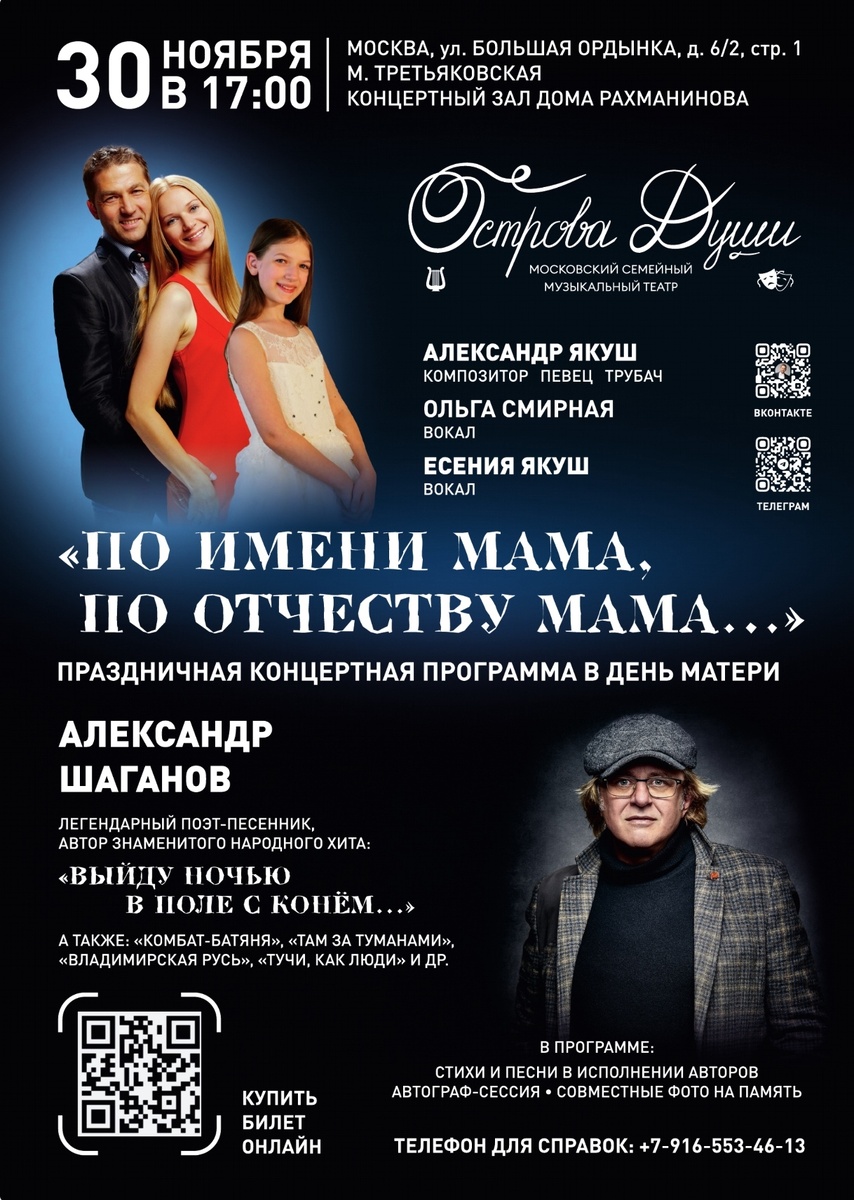 В ДЕНЬ МАТЕРИ, МОСКОВСКИЙ СЕМЕЙНЫЙ МУЗЫКАЛЬНЫЙ ТЕАТР «ОСТРОВА ДУШИ» и ЛЕГЕНДАРНЫЙ поэт-песенник - автор знаменитых ХИТОВ, чьи строки трогают до глубины души - АЛЕКСАНДР ШАГАНОВ, приглашают на ПРАЗДНИЧНУЮ ПРОГРАММУ «ПО ИМЕНИ МАМА ПО ОТЧЕСТВУ МАМА».
