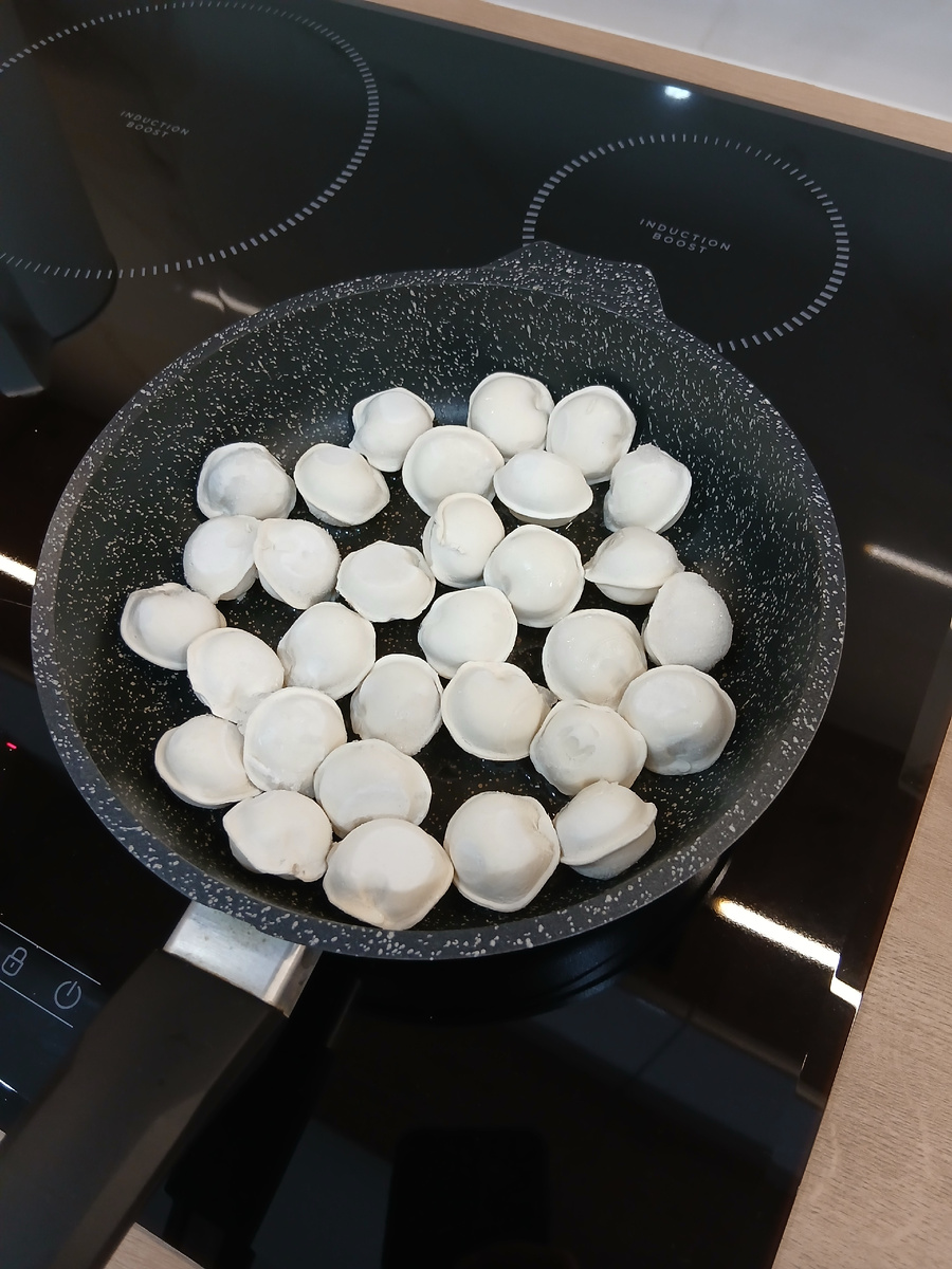 Здравствуйте, дорогие друзья! Хочу поделиться с вами одним из рецептов приготовления пельмений, надеюсь он вам понравиться. -Пельмени замороженные или свежие — 500 г -Бульон куриный быстрого приготовления (например, Роллтон) — 1 пакетик -Вода кипяток — около стакана (~200 мл) Для соуса: Сметана — 200 г. Чеснок — 2 зубчика Укроп свежий — небольшой пучок Перец черный молотый — по вкусу Томатная паста или кетчуп — 1 ст.л. Соевый соус — 1 ч.л. 1) Разогрейте сковороду с небольшим количеством масла. 2) Выкладывайте пельмени одним слоем и обжаривайте с каждой стороны до образования аппетитной золотисто-хрустящей корочки. Приготовление соуса: 1)Пока пельмени жарятся, в отдельной емкости соедините сметану, натертый чеснок, нарезанный укроп, добавьте щепотку перца, немного томатной пасты или кетчупа и чуть-чуть соевого соуса. Перемешайте до однородности. Доводка пельменей: 1) Когда пельмени хорошо подрумянятся, залейте в сковороду примерно 200 мл. кипятка с растворенным в нем куринным бульоном