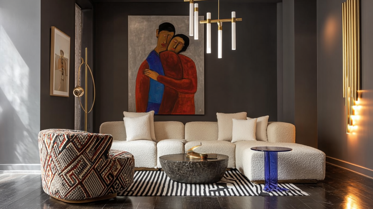 Металл — хром, сталь, алюминий. Из него делают каркасы, фурнитуру, светильники, декор. Он не маскируется, а выставляется напоказ. Видимые болты, крепления — это норма, даже преимущество.