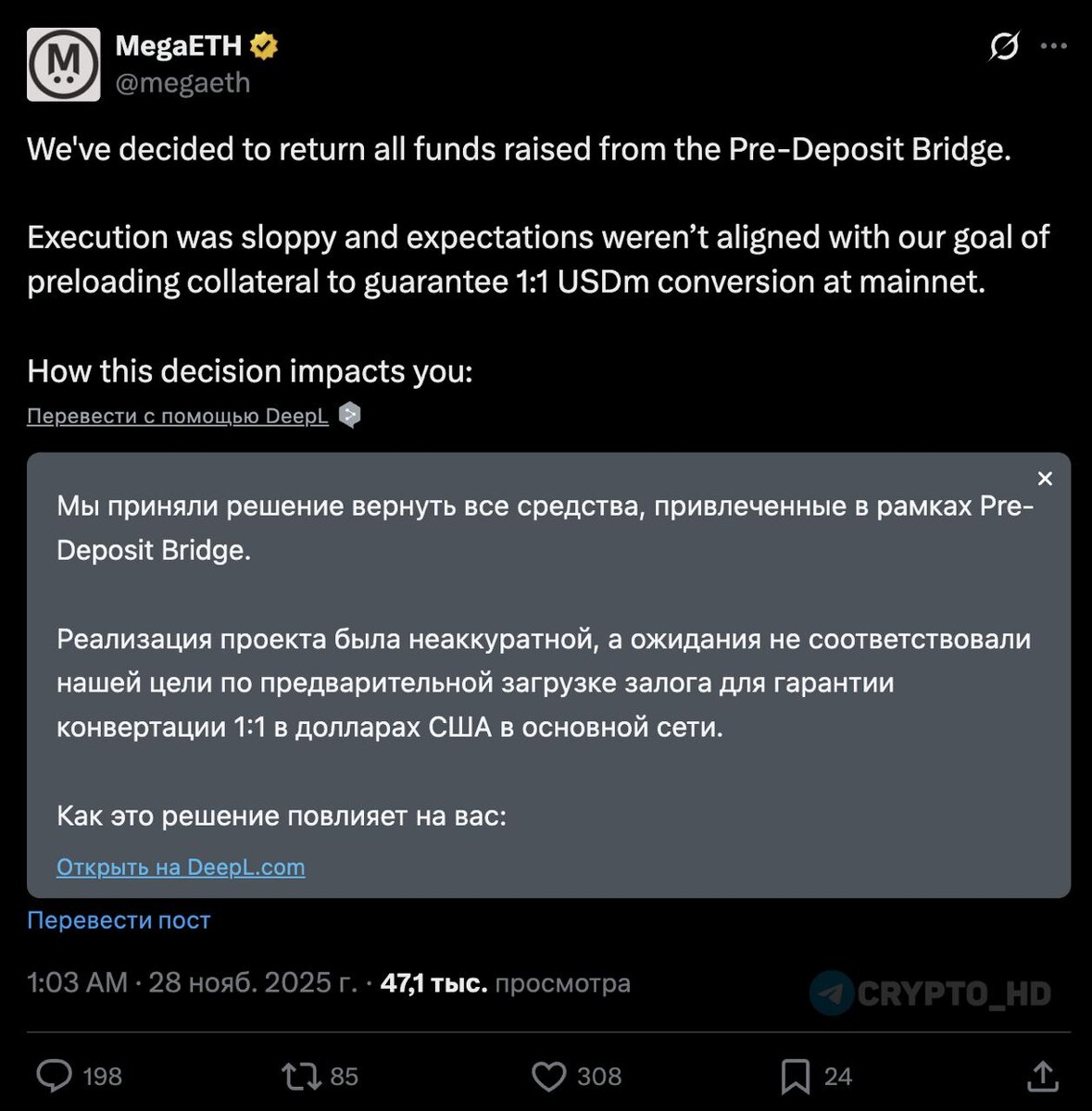 🔠 Руководство блокчейна MegaETH решило вернуть все средства, которые удалось собрать в рамках программы Pre-Deposit Bridge - объявление Ранее: провал Crypto Headlines