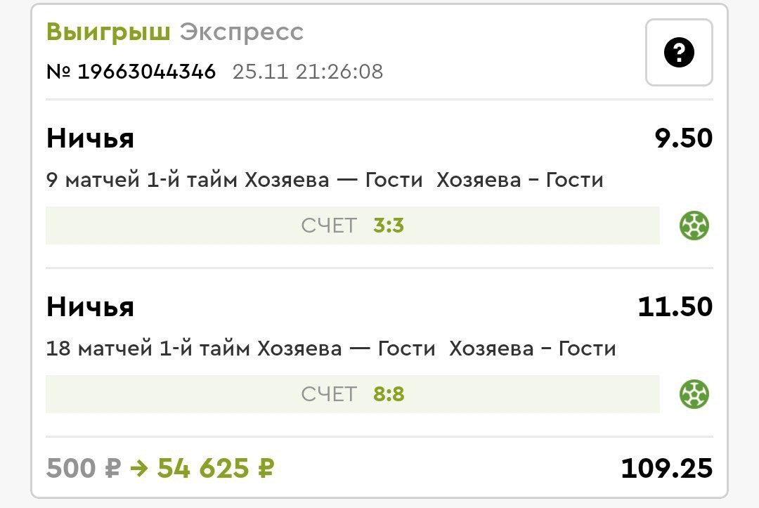 Нормально так вышел пресс с кэфом 109.25! 💪😅 Ставка делалась на первый тайм сразу на два дня (ЛЧ 25.11 и ЛК 27.11). Давно понял: мне нравится не конкретная команда, а большой коэффициент 🤣 Ну и получил мощный фрибет еще за это!
