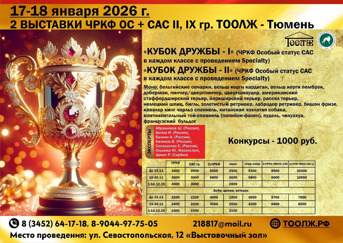 ⏰ 17 - 18 янв (50д) 🏛 #Тюмень #Россия #Выставка 🐶 Выставка собак: КУБОК ДРУЖБЫ 🏆 Тюменское областное объединение любителей животных Контакты и вопросы организаторам здесь: 🌐 https://www.petsman.ru/vystavki-sobak.php?mesto=68-tyumen 2 ВЫСТАВКИ ЧРКФ ОС + САС II, IX гр. «КУБОК ДРУЖБЫ - I» (ЧРКФ Особый статус CAC в каждом классе с проведением Specialty) «КУБОК ДРУЖБЫ - II» (ЧРКФ Особый статус CAC в каждом классе с проведением Specialty) Моно: бельгийские овчарки вельш корги кардиган вельш корги пемброк доберман пинчер/цвергпинчер цвергшнауцер американский стаффордширский терьер йоркширский терьер рассел терьер немецкий шпиц бигль золотистый ретривер лабрадор ретривер бишон фризе кавалер кинг чарльз спаниель китайская хохлатая собака континентальный той-спаниель (папийон-фален) пудель чихуахуа французский бульдог 🧑 👨 Эксперты: 🔹 Абракимов Ш. (Россия) 🔹 Бегма И. (Россия) 🔹 Белкин А. (Росс…