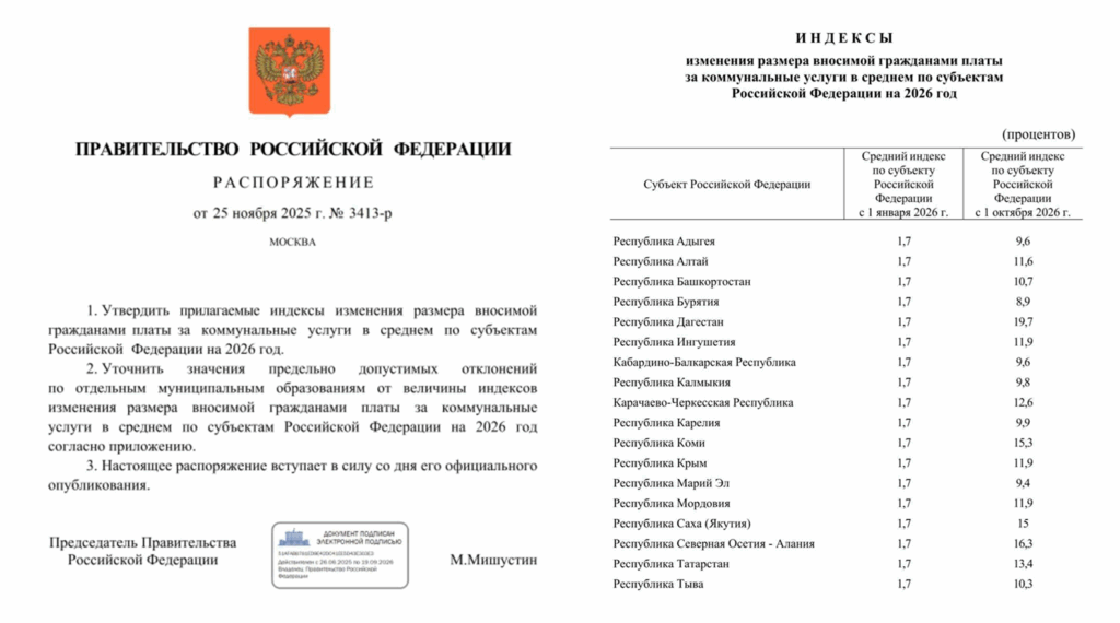 Правительство утвердило предельные значения индексации платы за жилищно-коммунальные услуги (ЖКУ) на 2026 год. Первый рост произойдет 1 января — предельное повышение тарифов для всех регионов будет одинаковым и в среднем составит 1,7%. А второй — с 1 октября, когда увеличение будет зависеть от региона. Самое большое повышение будет в Ставропольском крае — на 22%, в Дагестане — на 19,7%, в Тамбовской области — на 17,5%, в Санкт-Петербурге — 14,6%, в Москве – на 12,8%.