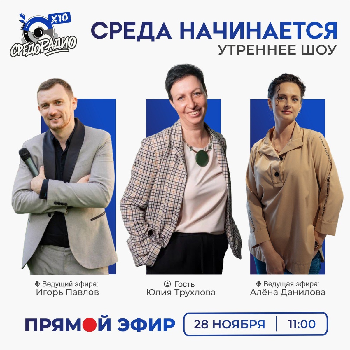 🌞 Доброе утро, СО-СОЗИДАТЕЛИ! Готовы к мощному, живому, светлому утру? Тогда отмечайте в календаре пятницу, 28 ноября, потому что в 11:00 по МСК в студию утреннего шоу «СРЕДА НАЧИНАЕТСЯ» к Игорю Павлову и Алёне Даниловой ворвётся человек, который умеет включать сердца — Юлия Трухлова! 🎙✨ 💛 Президент сообщества «Университет детства» 🏆 Двукратный победитель «Большой игры имени Льва Выготского» 🧠 Педагог-психолог высшей категории 🎓 25 лет опыта работы с детьми, родителями, педагогами 💫 Человек, который честно говорит: «Я — счастливый человек. Кайфую по жизни и делюсь этим кайфом с миром» И это правда — рядом с ней уровень энергии поднимается автоматически. Будет много света, мудрости, юмора, простых истин и глубоких смыслов. Приходите за вдохновением и теплом которые так нужны в конце недели 💛 🔗 Эфир: https://myradio24.com/5559 📱 Приложение MyRadio24: https://dzen.ru/media/sredoradio/-68945075272f5b1d26ed07e3 ✈️ Telegram: https://dzen.ru/id/68347b0544414e3a879796a0 🎵 VK: vk.