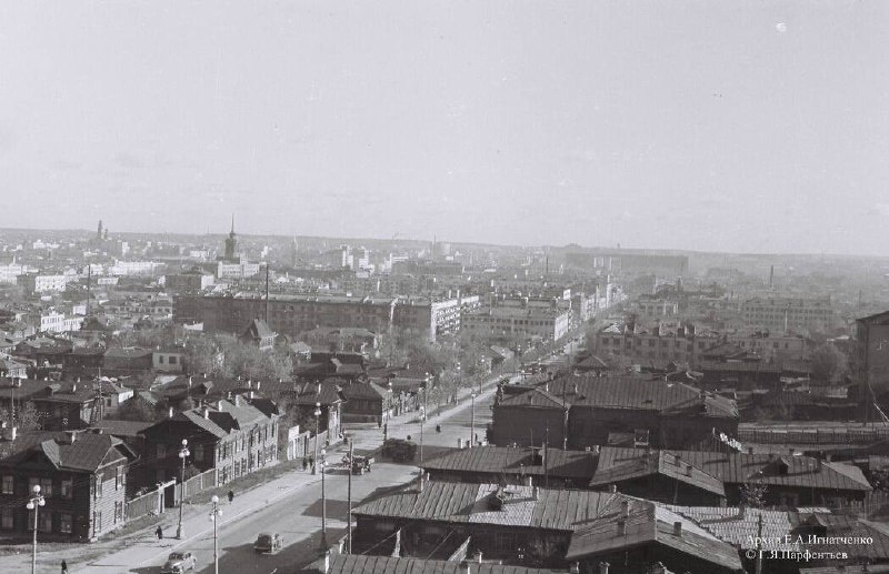 Город Свердловск. Панорамный вид вдоль улицы Малышева. Фотография датируется 1958 г. Автор — Г. Я. Парфентьев. Снимок выполнен с крыши/фасада здания суда по адресу: ул. Малышева, дом 4.