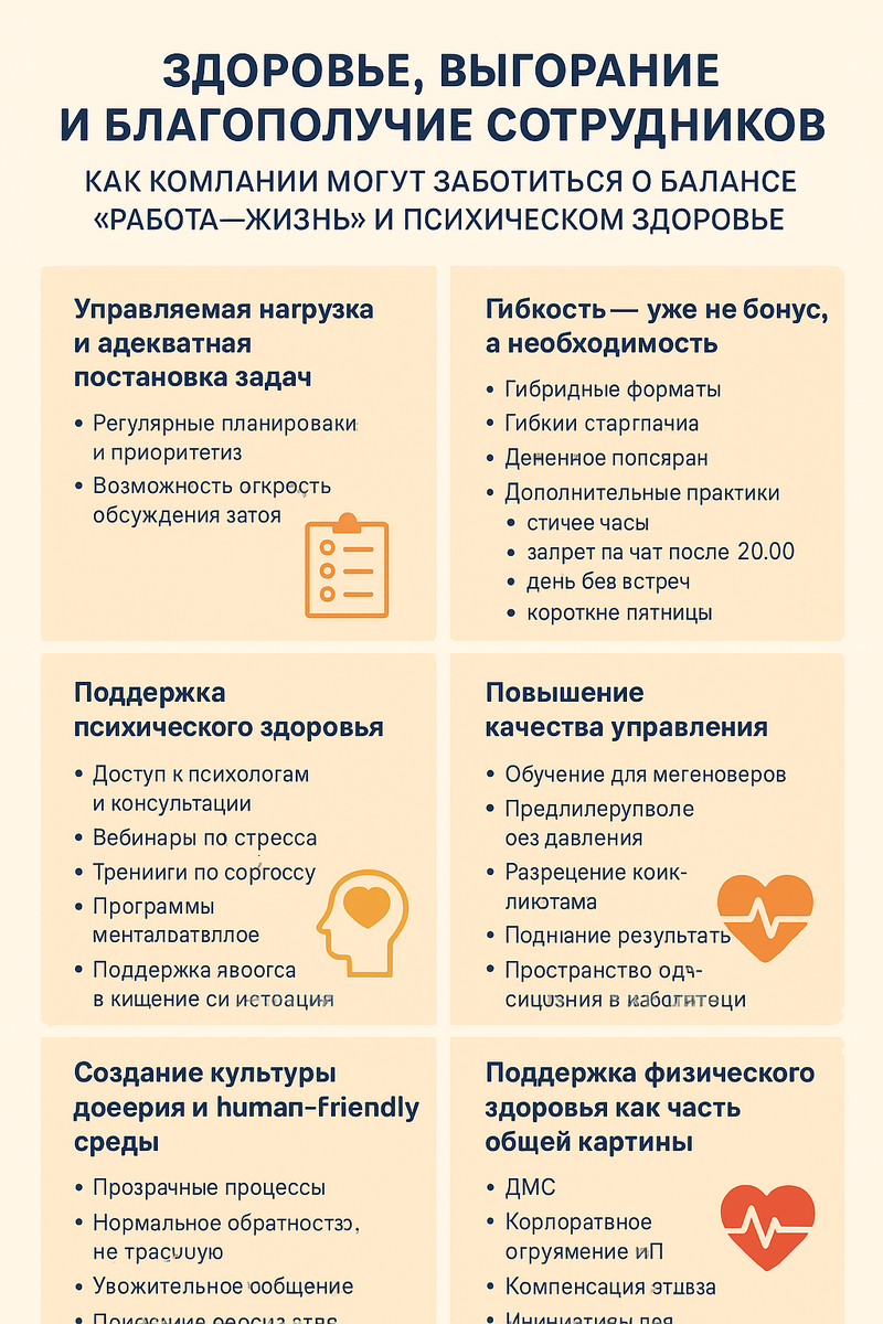 Компании, которые выстраивают системный подход — от гибкости до поддержки руководителей — получают сильные команды, которые могут справляться с изменениями, работать с удовольствием и приносить результат без ущерба для здоровья.