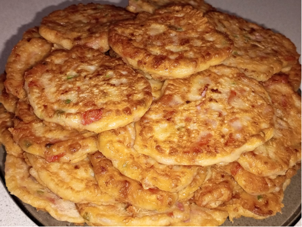 Ингредиенты: - ветчина – 200 гр.; - сыр – 100 гр.; - свежий томат – 1 шт.; - зеленый лук – 0,5 пучка; - растительное масло для жарки. Тесто: - 200 мл. молока; - 1 яйцо; - 150 гр. муки; - ¼ чайной ложки соли; - 1 ч. ложка разрыхлителя. В глубокую емкость добавить яйцо, слегка взбить вилкой или венчиком, добавить соль, молоко, муку с разрыхлителем, хорошо перемешать, отставить в сторону. Иногда разрыхлитель заменяю на ¼ чайной ложки дрожжей. Знакомая вместо разрыхлителя, дрожжей, молока добавляет 250 мл. кефира. Сыр, ветчину натереть на мелкой терке. Томат желательно очистить от кожицы, очень мелко нарезать ножом. Очень мелко нарезать зеленый лук. В некоторых, подобных рецептах предлагают использовать болгарский перец, на мой взгляд, очень портит вкус оладий. Лук, сыр, томаты, ветчину добавить в тесто, перемешать. Столовой ложкой сформировать оладьи, обжаривать на раскаленной сковороде, среднем огне с добавление растительного масла с двух сторон. Приятного аппетита.