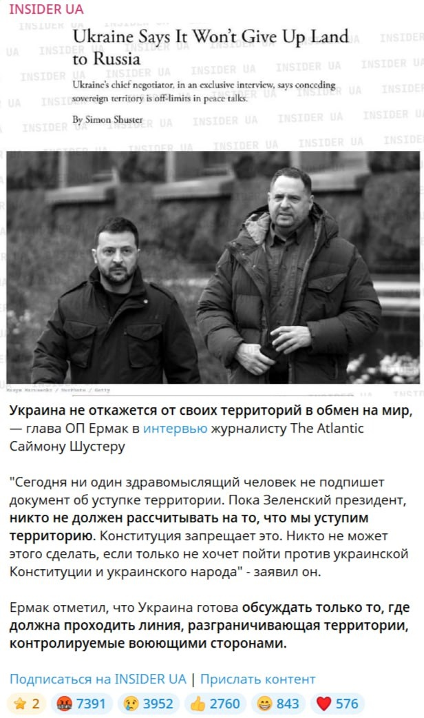 В ответ на пост Неделю назад писал, что Зеленский не будет подписывать договоренностей предусматривающих передачу территории в пользу России. Вчера это подтвердил глава его администрации Ермак в интервью The Atlantic. На скринах комментарии украинцев к этой новости (осторожно мат).