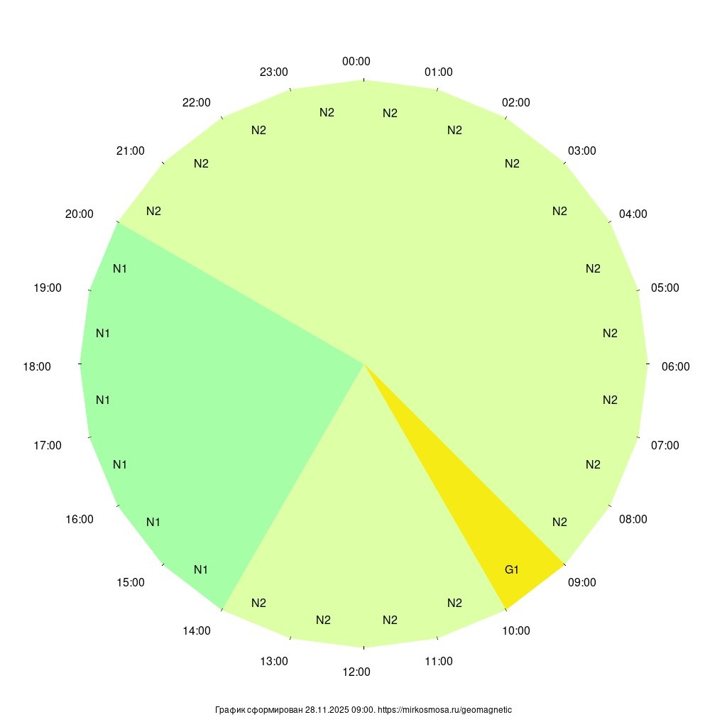 Геомагнитный прогноз на 28.11.2025: ожидается, что с 09:00 будет геомагнитная буря класса G1 (Незначительная, Kp=4.67), с 10:00 до 14:00