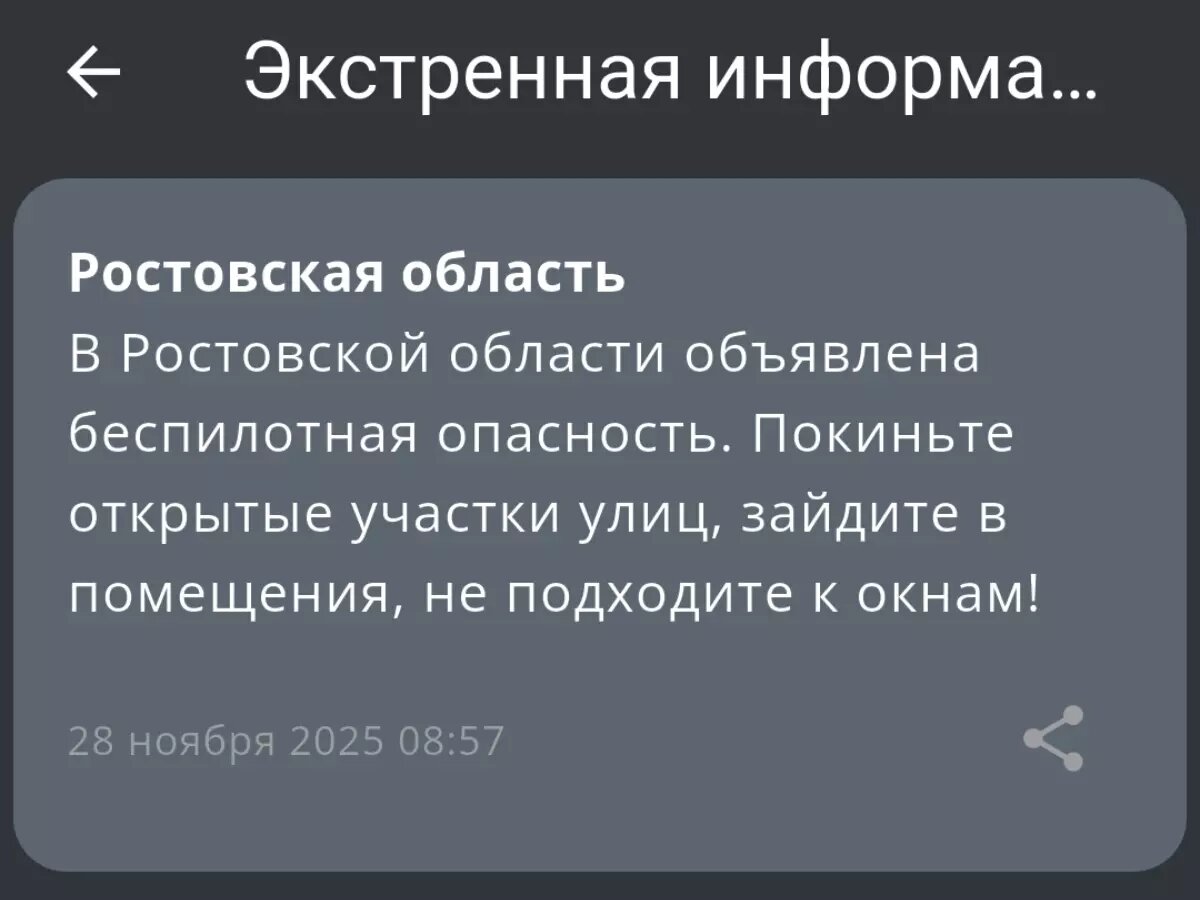 Беспилотную опасность объявили утром 28 ноября в Ростовской области