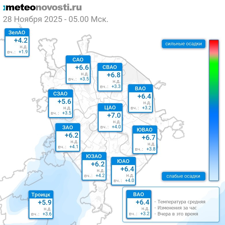 В 5:00 в Москве было от +4.8°C до +7.2°C, средняя температура +6.4°C #погода #Москва #осень #температура #28ноября #пятница
