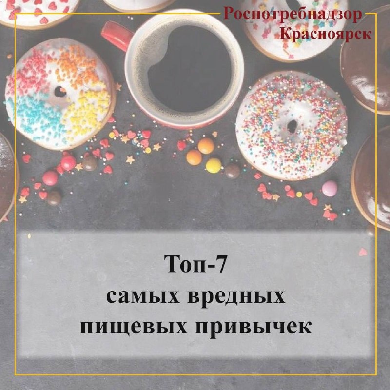 В Роспотребнадзоре рассказали о 7 главных вредных пищевых привычек 1️⃣ Едите быстро? Мозг не успевает уловить насыщение → переедание и проблемы с пищеварением. Ешьте медленнее. 2️⃣ Пропускаете завтрак? Утренний приём пищи улучшает концентрацию и снижает тягу к лишним калориям. Завтрак — лучший момент для вкусностей. 3️⃣ Наедаетесь перед сном? Вечером обмен веществ замедляется — лишний вес и плохой сон обеспечены. Лучше лёгкий перекус: кефир или яблоко. 4️⃣ Пьёте мало воды? Лёгкое обезвоживание = усталость и ложный голод. Пейте воду регулярно — аппетит станет легче контролировать. 5️⃣ Больше 3 чашек кофе в день? Чрезмерный кофе повышает нагрузку на сердце. Оптимум — до трёх. 6️⃣ Перебарщиваете с сахаром? Избыток — риск диабета, ожирения и кариеса. Хотите сладкого — выбирайте мёд. 7️⃣ Едите за гаджетами? Отвлечение = неконтролируемое количество пищи и меньше удовольствия от еды. Уберите экран во время приёма пищи. Фото: Роспотребнадзор Красноярского края 🤩Новости Сибири | Прислать но