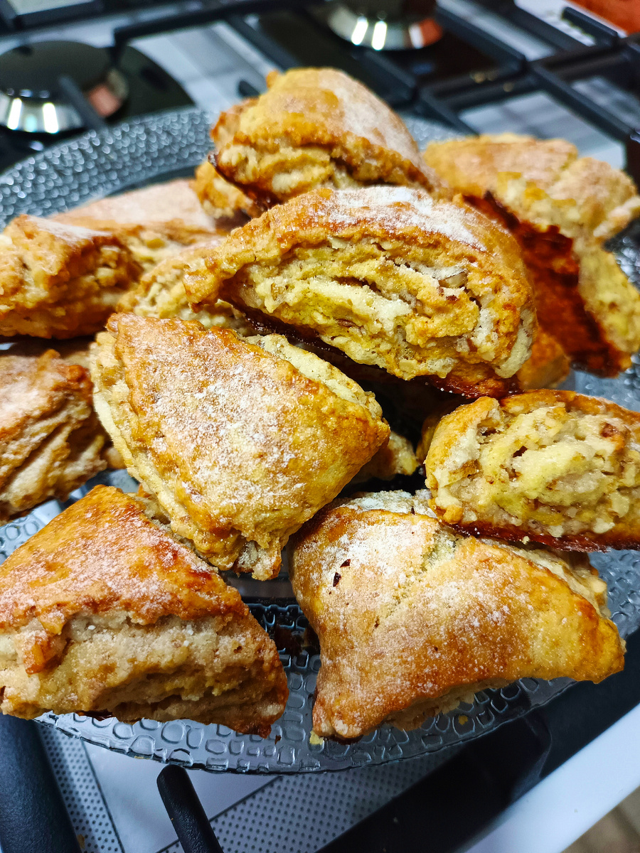 Холодное тесто разделить на две части ( можно и не делить, но так удобнее раскатывать) и каждую часть раскатать толщиной примерно 2 мм, смазать яичным белком и на каждую часть теста высыпать 1/2 часть начинки, распределить по поверхности теста и аккуратно свернуть в рулет, сверху не сильно надавливая пройтись по рулету скалкой.