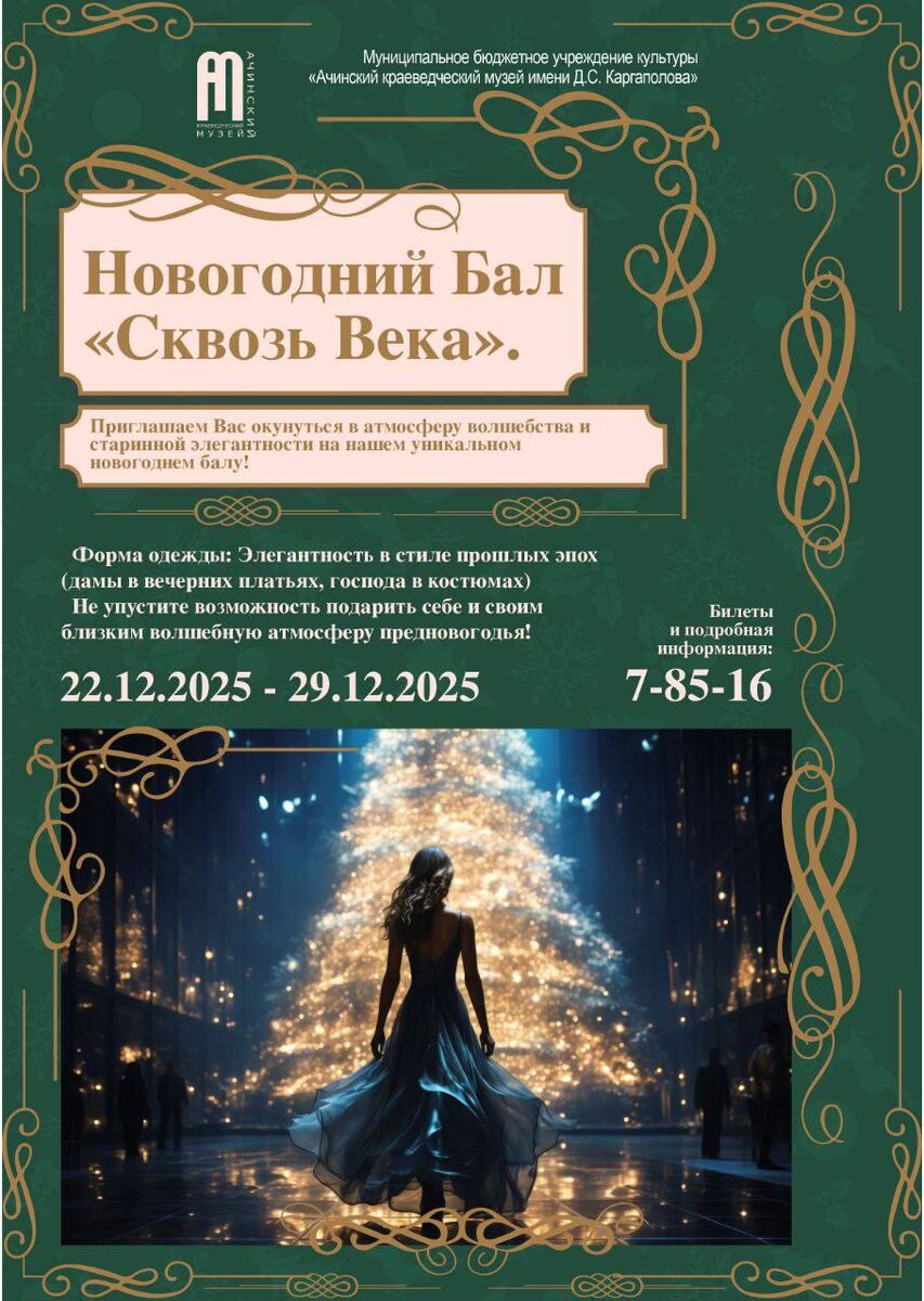 ✨Когда время замирает, а прошлое оживает… Запись на Новогодний Бал «Сквозь Века» всё ещё ведётся! Если вы мечтали хотя бы на один вечер прикоснуться к элегантности ушедших эпох — сейчас самое время. Представьте: морозный зимний вечер, узоры на окнах, словно старинные гравюры, мягкий свет свечей и музыка, которая переносит в другую эпоху. В стенах нашего музея, где бережно хранятся тайны веков, оживёт настоящая новогодняя сказка. Вас ждут: ✨ завораживающий вальс ✨ таинственный язык веера ✨ атмосфера бала, где легенды становятся реальностью ✨ и, конечно же, встреча с главным новогодним волшебником Подарите себе и близким ночь, наполненную шармом, красотой и предновогодним чудом. 📅 22.12.2025 – 29.12.2025 📞 Бронирование и информация: +7(39151)7-85-16 #КрайВысокойКультуры #АчинскийКраеведческийМузей