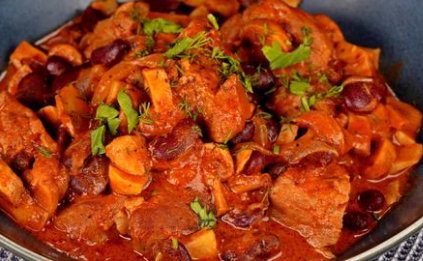Ингредиенты: - 600 г мякоти свинины - 1 луковица - 2 моркови - 100 г стручковой фасоли - 200-300 г шампиньонов - 1 ст. л. растительного масла - 1 томат (или 1-2 ст. л. томатной пасты) - 2 ч. л. муки - 2-3 ст. л. сметаны - черный перец молотый - соль Приготовление: Мясо обмыть, очистить от сухожилий, нарезать кубиками. Обжарить в глубокой сковороде на растительном масле. Лук мелко нашинковать и потушить вместе с мясом до прозрачности. Подливая горячую воду (1-2 стакана), продолжать тушить мясо, пока оно не станет полумягким. Порезать морковь и стручки фасоли на 3 части. Положить овощи в мясо, добавить соль, перец (можно и другие приправы) и не снимать с огня до готовности мяса. Отдельно приготовить грибы. Крупно порезать их и тушить в собственном соку или с небольшим количеством жира. Затем заправить нарезанным томатом или томатной пастой, мукой и сметаной, перемешать. Мясо с овощами положить в огнеупорную посуду, сверху разместить грибы. Запекать 15 минут в духовке. В качестве гарнира