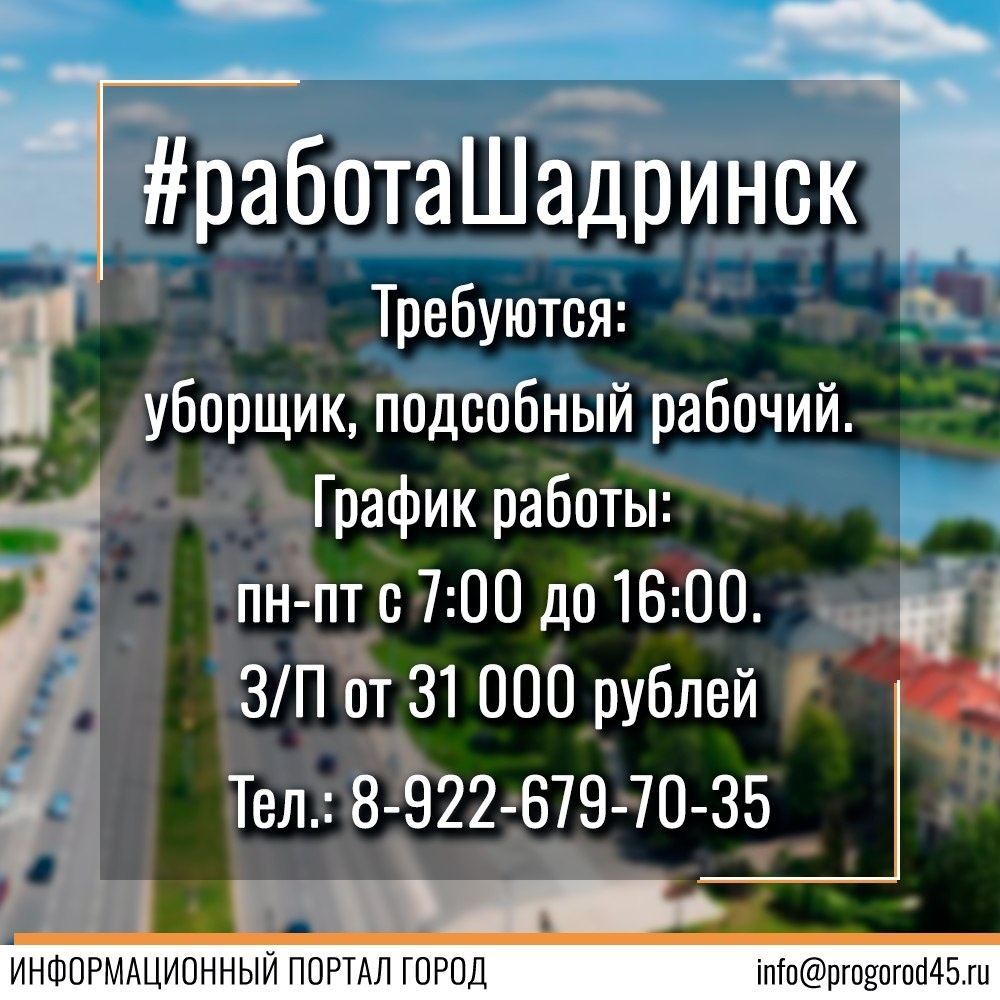 Требуются: уборщик, подсобный рабочий. График работы: пн-пт с 7:00 до 16:00. З/П от 31 000 рублей. Обращаться по телефону 8-922-679-70-35 #Шадринск #работа #вакансия #требуется