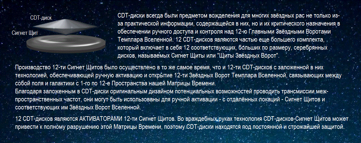 CDT-диски есть набор из двенадцати дисков Голографической Записи [Опр.1] , переданные в дар Клойстер расе людей Земли УРТАЙТАМ, расами БРЕНО (БРЭНОА, везде по разному...) Ордена 5-й Гармоник Вселенной, Основателями нашей Матрицы Времени и расами АЗУРИТОВ Сириуса 2-й и 3-й Гармоник Вселенных - 248 000 лет тому назад. Этот дар 12-ти CDT-дисков и сопровождающих их соответственно 12-ти Сигнет Щитов (“Щиты Звёздных Ворот”), являющихся устройствами допуска к Звёздным Воротам, был передан в ознаменование ВОЗОБНОВЛЕНИЯ Договора ко-Эволюции Изумрудного Пакта.