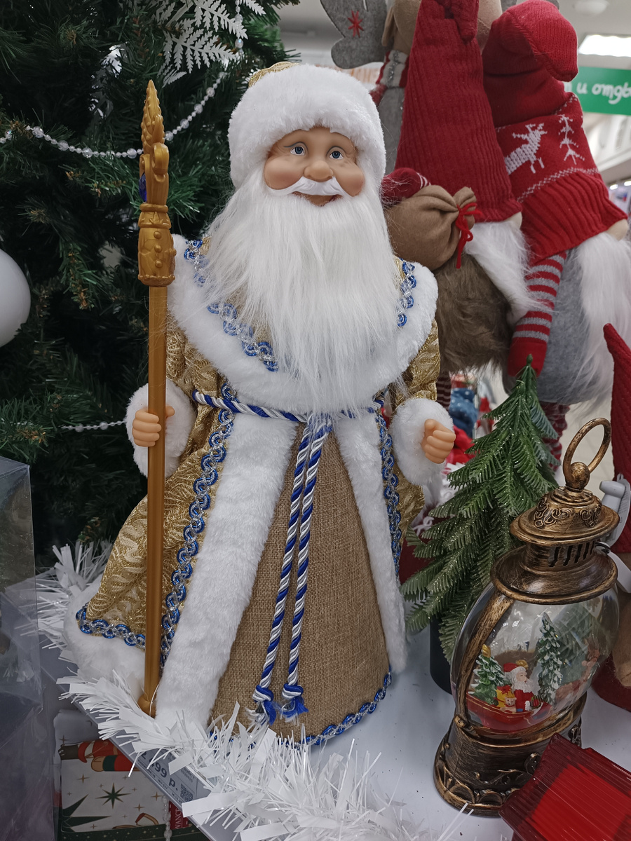 Приветствую! Этот выпуск можно назвать - забрела в поисках того, что до этого не находила в ФИКС ПРАЙС. Классная и оригинальная коллекция посуды, новогодние товары... Но давайте по порядку. Начну с Деда Мороза, который лицом опять почему-то похож на Санту... Но все же одеждой Дедушка наш! Наконец он самый, которого столько лет ждали в наших магазинах! Ловите, только почему-то он в бежевой шубке, которая похожа на одеяние Снегурочки))) цена: В общем, витрина тут оформлена шикарно! Все по новогодней теме классно выставлено. Тут и диско-шары, тут и сервировочные тарелки и гномики... Цены, надеюсь видны тут, можно увеличить фото. Покажу несколько поближе: Кстати, акция на электрическую железную дорогу для деток с креплением на елку. А сами елки тоже покажу. и еще одна витрина: И самый притягательный отдел для меня - это посуда! Это моя слабость... Тут появилась коллекция в подарочных коробках, которые можно брать, если идете в гости к новоселам, например... Бокалы и стаканы - частич
