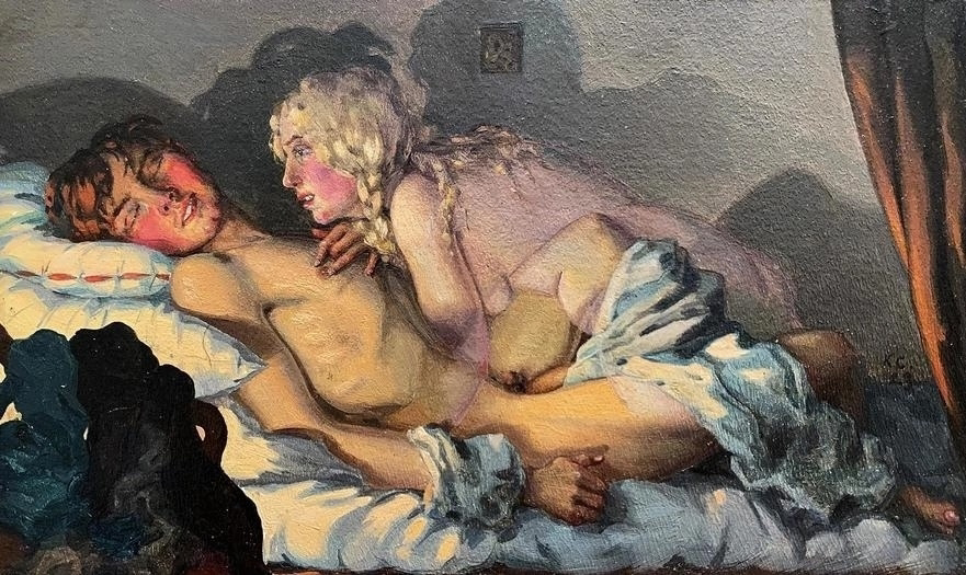Картина Константина Сомова «Суккуб» — один из тех редких случаев, когда художник обращается к теме сна не как к декоративному мотиву, а как к самостоятельной реальности, обладающей собственными законами. Сон здесь не граница между явью и фантазией, а особая зона, в которой чувства обретают материальность, а желания — форму, способную коснуться кожи. Перед зрителем — юноша, погружённый в тяжёлый, глубокий сон. Тело его расслаблено, руки раскинуты, что невольно делает его похожим на героя классической сцены, только лишённого всякой героической воли. Он — пассивен, открыт, беззащитен. И именно в эту беззащитность входит фигура женского облика — суккуба, мягко склоняющаяся над его губами. Странная природа её тела Сомов изображает суккуба не как фантастического монстра, каким его описывали средневековые демонологи, а как видение, тонкое и зыбкое, словно пронизанное светом изнутри. Верхняя часть её фигуры выписана тщательно, почти интимно: лицо, шея, линия плеч. Но чем ниже скользит вз