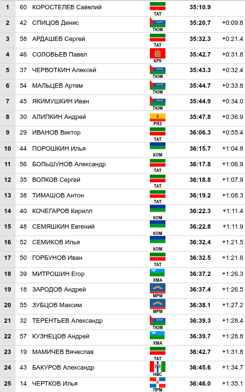 📍 ЛС "Тирвас" Гонка 15км СВ. Мужчины Через несколько минут после яркой женской «разделки» стартовали в сезон Кубка России мужчины. Победу одержал Савелий Коростелев — 21-летний лыжник из Татарстана, который показал результат 35:10.9. Конечно, победа Савелия не удивляет, как приятно удивляет реально хороший ход и форма Спицова. «Задача была — максимально грамотно разложиться по дистанции и выложиться на последнем круге. В этот раз получилось добавить, тем самым не оставив шансов Спицову», — признался Коростелев в эфире «Матч ТВ». Савелий всю гонку заочно рубился с олимпийским чемпионом Денисом Спицовым в итоге зафиксировав отрыв в 9,8 секунды. Спицов шёл уверенно с самого старта, чувствовал силы, но уступил обстоятельствам, с которыми он борется уже несколько лет. «В очередной раз решили лыжи, хотя самочувствие великолепное. Уверенно шел с первого круга… Если бы было минус 10, то я точно бы выиграл. Нужно поискать и поработат