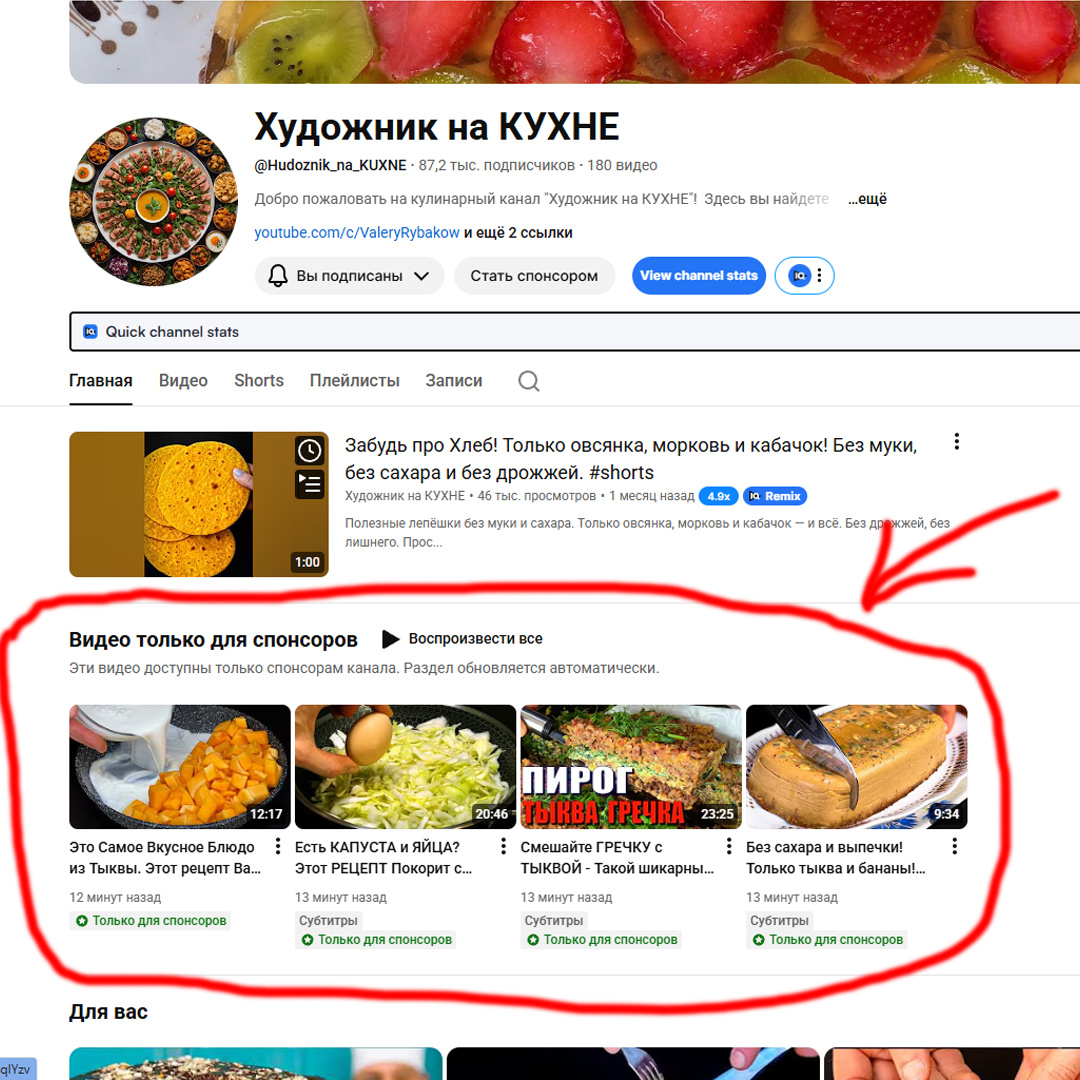 Дорогие друзья! Прекрасная новость! На канале появилась новая вкладка "Видео для спонсоров". Я думал как я могу отблагодарить спонсоров канала за их поддержку в развитии канала и творчества. И я придумал дополнительно к основным рецептам, которые регулярно выходят на канале "Художник на КУХНЕ" еще и эксклюзивные рецепты - как раз для спонсоров - это моя маленькая благодарность им. Вторая новость - теперь стать спонсором стало еще легче - меньше чем за 1 доллар в месяц. Присоединиться к желающим стать спонсором канала и поддержать канал и мое творчество можно по ссылке: https://www.youtube.com/channel/UC1cMm8VB0ZVEIbQu4u8of3g/join Благодарен каждому!