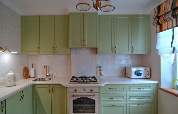 Фото: Анастасия Мурина Планировка квартиры осталась без изменений. В самой большой комнате обустроили спальню, а вторая стала гостиной. Помимо этого, в квартире есть раздельный санузел, кухня и прихожая-коридор. Кухонный гарнитур был выполнен на заказ с учетом пожеланий хозяйки, которая предпочла отдельностоящую технику. Холодильник и микроволновая печь подобраны в единой цветовой гамме с интерьером. Для удобства сушки для посуды размещены как в верхнем, так и в нижнем модулях, а