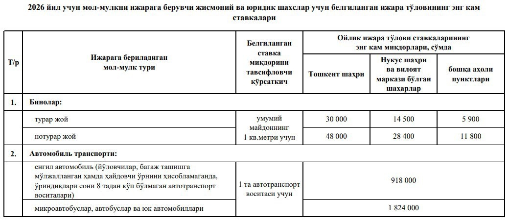 O‘zbekistonda ko‘chmas mulk va avtotransport uchun ijara to‘lovi eng kam stavkalari oshirilishi mumkin Xususan, 2026-yilda Toshkentda turar joyni ijaraga berish bo‘yicha eng kam stavka 1 kvadrat metr uchun 30 ming so‘m, noturar joyni ijaraga berish bo‘yicha eng kam stavka 48 ming so‘m etib belgilanishi mumkin. @daryolive