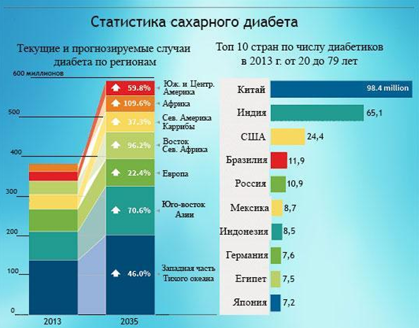 По прогнозам ученых, количество заболеваний будет только расти и к 2035 году достигнет 600 млн чел. в мире. Лидерами по заболеваемости является Китай, но и Россия находится не так далеко от верха - на 5 месте.
