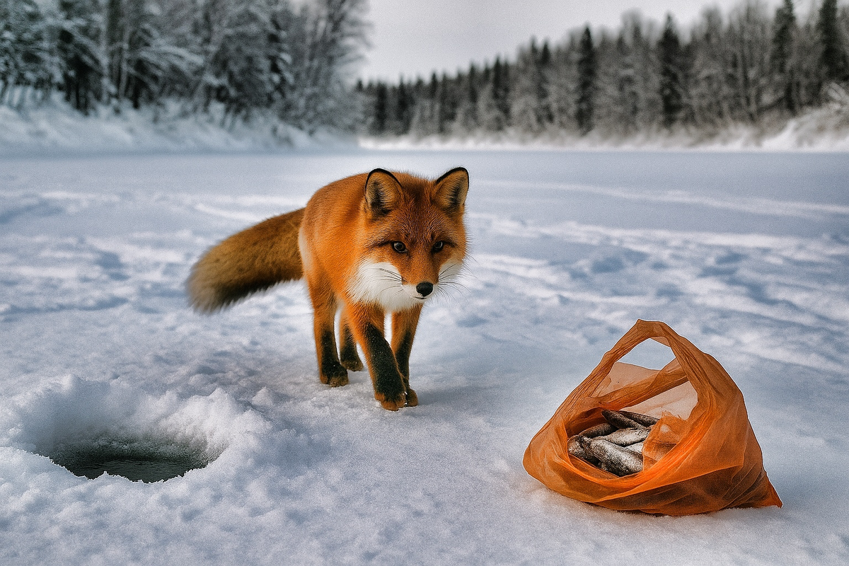 Зима 2020 года. Мы с товарищем Сергеем рыбачили на одной из моих любимых стариц Етыпура — «Подкове». Место это красивое, особенно зимой. Тишина, скрип снега под сапогам, благодать. Сергей как раз расставлял жерлицы. Вместо живца у него была мойва — рабочая приманка на Ямале. Он оставил пакет с остатками прямо на льду, у одной из лунок, и пошёл рыбачить неподалёку. А я остался рыбачить неподалеку. Минут через двадцать в поле зрения появился тёмно-рыжий силуэт. Идёт осторожно, почти ползёт, голова опущена, хвост — как факел — тянется за ней по снегу. Я сразу понял — лиса. Подкрадывалась она не к людям, а к приманке. И ведь что удивительно — ни шума, ни суеты. Подошла, схватила пакет с мойвой — и как ни в чём не бывало скрылась в лесу. Когда Сергей вернулся, я только развёл руками: — Всё, Серёга, твой живец ушёл на прокорм местной фауне. Он сначала не поверил, пока не увидел следы в снегу. Это, кстати, не единственный случай. Иногда лисы подходят к жерлицам ночью и буквально снимают с н