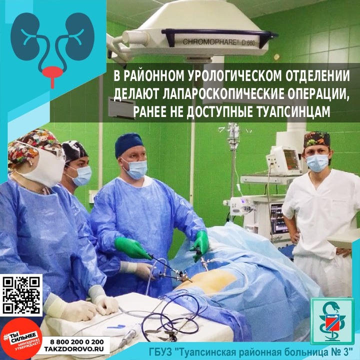 МЫ ДЕЛАЕМ ОПЕРАЦИИ, РАНЕЕ ДОСТУПНЫЕ ТОЛЬКО НА КРАЕВОМ УРОВНЕ Специалистами районного урологического отделения был выполнен ряд лапароскопических операции, ранее не доступных жителям Туапсе и Туапсинского округа: - лапароскопическая нефрэктомия; - лапароскопическое иссечение кист почки; - лапароскопическая уретеролитотомия (удаление камня мочеточника); - лапароскопическая пластика лоханочно-мочеточникового сегмента. Проведённые операции направлены на лечение таких заболеваний как аденома предстательной железы, кисты почек, стриктура (сужение) лоханочно-мочеточникового сегмента, а также мочекаменной болезни. Также впервые в Туапсе выполнено несколько лапароскопических аденомэктомий (операции по удалению аденомы простаты). Учитывая малоинвазивность операции с использованием эндовидеоскопических технологий в сравнении с открытыми методиками, послеоперационный период для пациента протекает гораздо легче и значительно сокращается время госпитализации. #укреплениеобщественногоздоровья