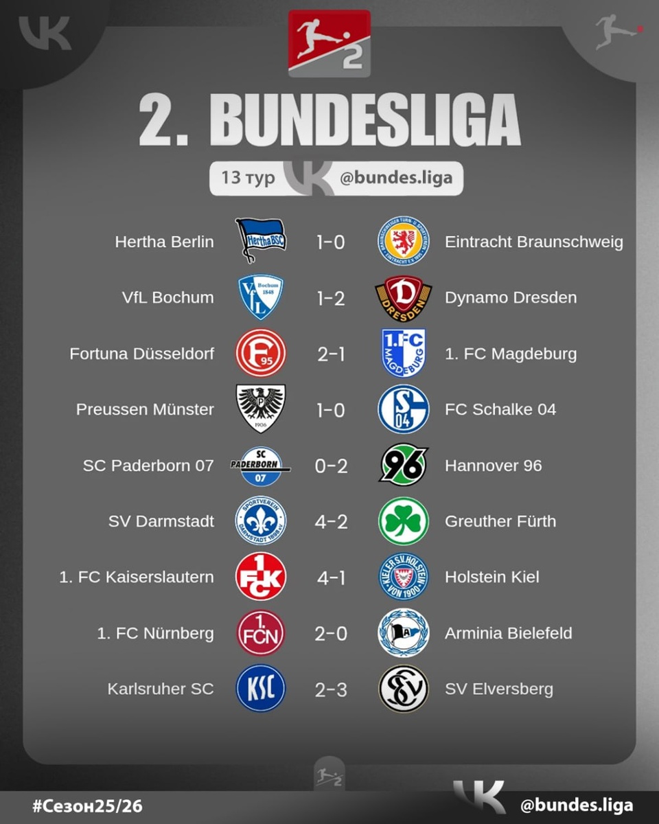 #2Бундеслига 🇩🇪⚽️ Итоговая таблица Второй Бундеслиги и все результаты матчей после 13 туров ✅ ⭐️ MAX -❤ Телеграм - ✅️Вконтакте