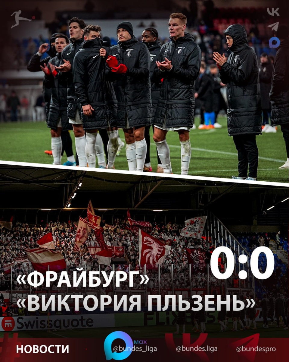 «Фрайбург» сыграл вничью на выезде с «Викторией Пльзень» 🤝 Немцы идут четвёртыми в таблице общего этапа Лиги Европы после 5-ти туров, имея 11 очков. Клуб из Чехии десятый - 9 очков. ⭐️ MAX -❤ Телеграм - ✅️Вконтакте