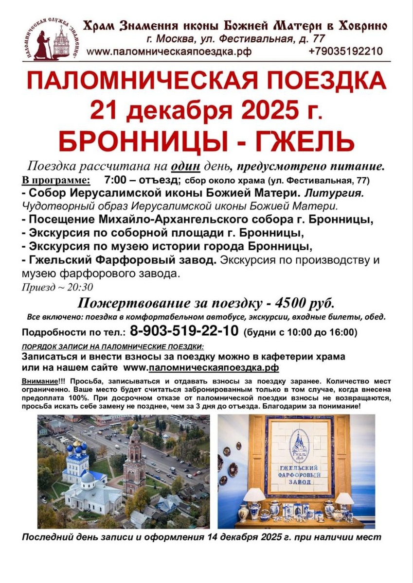 21 декабря 2025 г. состоится паломническая поездка от Знаменского храма в Ховрино в г. Бронницы и Гжель (на 1 день + питание). Запись в кафетерии храма или на сайте https://паломническаяпоездка.рф Подробнее https://паломническаяпоездка.рф/index.php/sobytiya/79-novosti/688-