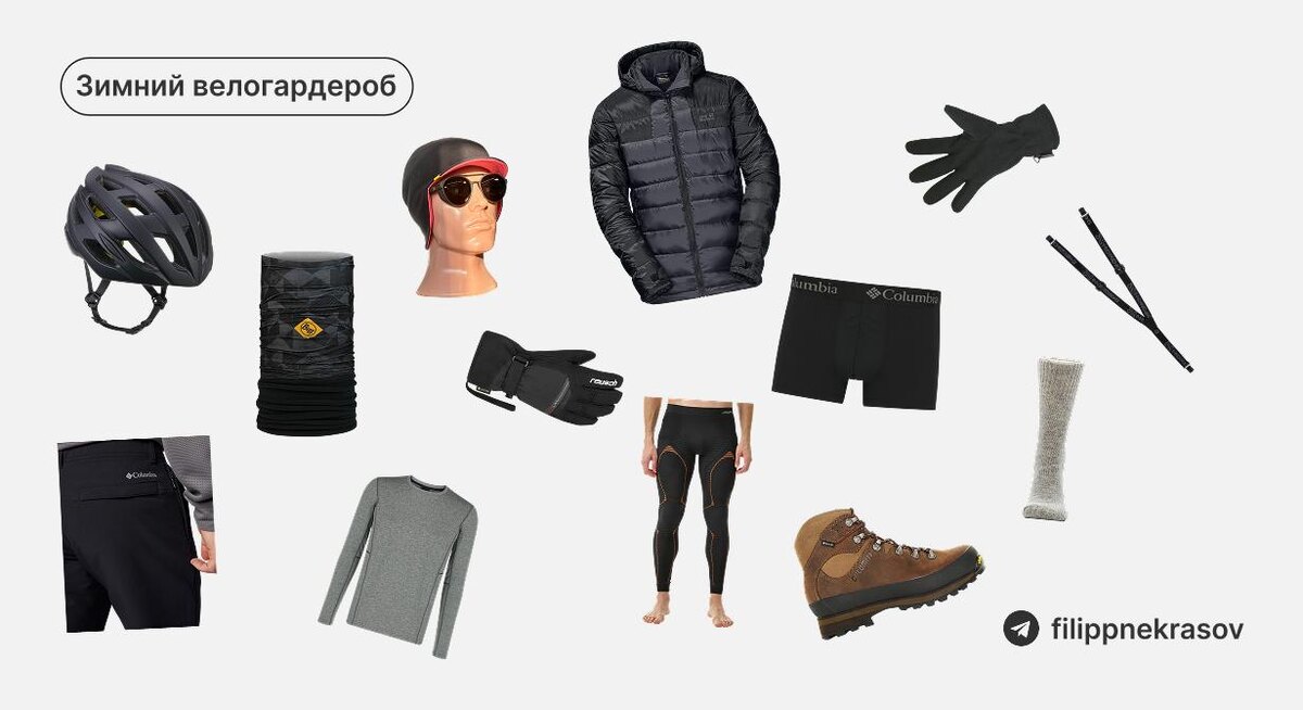 В ЧЕМ КАТАЮСЬ ЗИМОЙ Продолжаем #подборка_снаряжения@filippnekrasov. С осенней экипировкой разобрались - теперь поговорим о зимней. В этом комплекте что-то остается, что-то меняется, но без добавления лишних слоев. Что это Комплект одежды на температуру от -2 до -8 градусов. Для каких условий Городские и загородные поездки в снежную и ветреную погоду. Голова ➡ Шлем: BBB Hawk ➡ Подшлемник: Dalekodolgo ➡ Бафф: Buff Polar Верхняя часть ➡ Куртка: Jack Wolfskin Greenland ➡ Термобелье: Northland ➡ Подтяжки: Nordski Нижняя часть ➡ Трусы: Columbia Short Boxer ➡ Термобелье: Accapi X-Country ➡ Штаны: Columbia Black Mesa Warm Pant Обувь и аксессуары ➡ Носки: Norveg -60 ➡ Обувь: Dolomite Tofana GTX ➡ Перчатки (вариант 1): Век Альпина виндблок ➡ Перчатки (вариант 2): REUSCH Stanley GTX Почему этот комплект Сохраняю принцип минимализма - только необходимые теплые слои без лишней "капусты". Все вещи проверены в зимних условиях. Что дальше Экстрим-вариант для температур до -20°C. Есть вопросы
