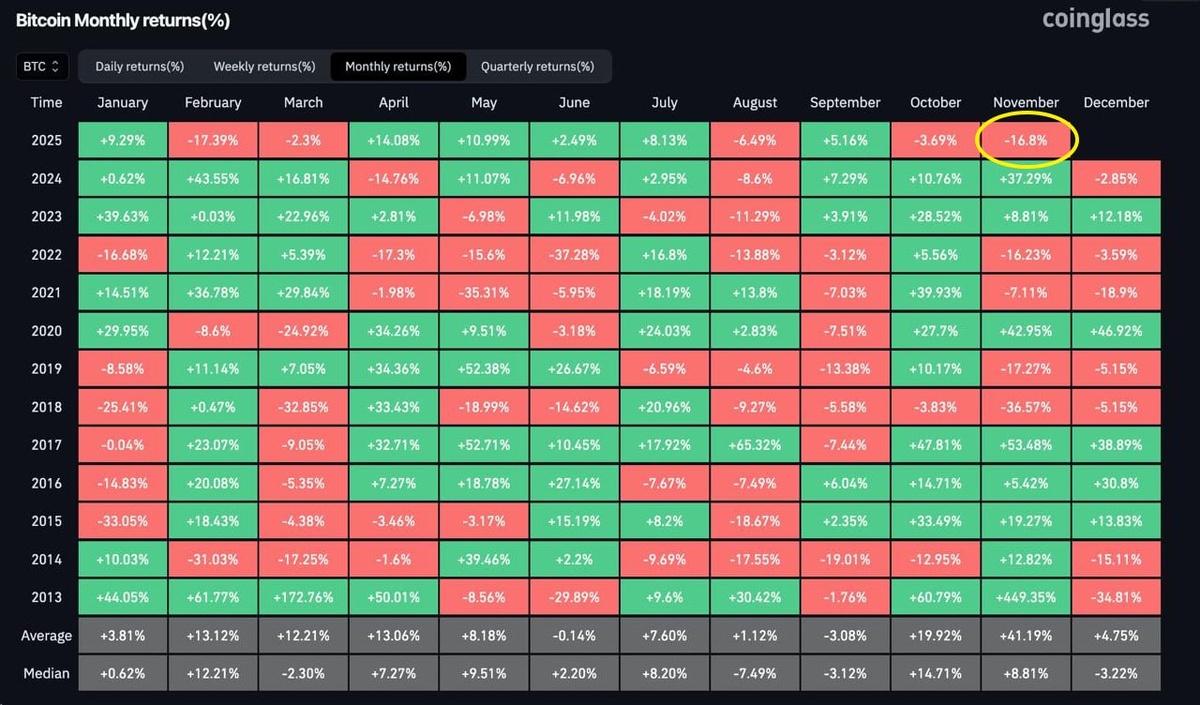 Ноябрь 2025г может стать для BTC третьим худшим ноябрем за всю историю — данные Coinglass