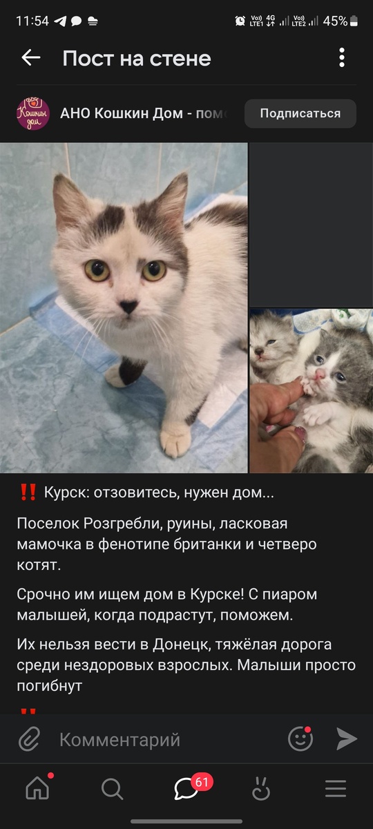 История Муры для нас началась в мае 2025 года когда Донецкие волонтёры приехали в Курскую область и стали вывозить животных из опасных зон. Тогда было спасено много животных, но среди них были в основном взрослые матерые коты и кошки. Несмотря на то что в тот момент на улице была уже весна котят в разрушенных районах просто не было. Отсутствие еды, постоянный стресс от грохота, дикие животные которые вышли в деревни от куда уехали люди всё это не даёт никаких щансов на выживание малышей. Но в одном из посёлков нашлась кошечка которая несмотря не на что смогла сохранить и вырастить своих деток. Малыши только открыли глазки и ещё сами не кушали и не выходили из безопасного уголка и мама кошка отчаянно охраняла своё потомство и только это наверно и спасло их в том самом ужасном месте. У нас освободилось к тому времени пару мест и мы были готовы взять кого-то кто очень в этом нуждался. И тут видим пост. Вывезли котят и кошку с руин села, везти в Донецк нельзя.... Ну как не возьмёшь? Так
