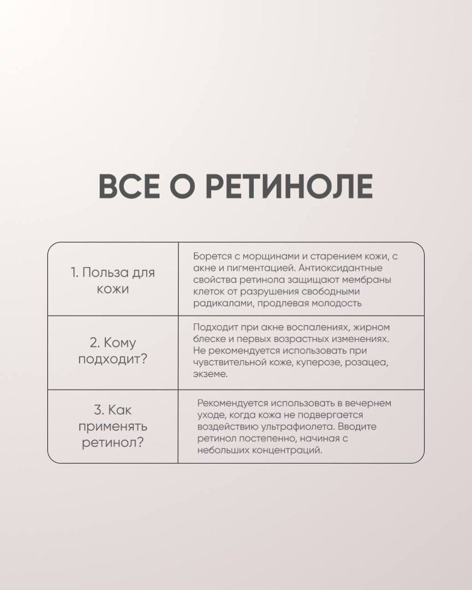 Ретинол: зачем он нужен и как его правильно использовать Ретинол считается одним из самых эффективных компонентов в косметологии. Он работает на глубоком уровне и помогает решать сразу несколько задач⬇️ Для чего нужен ретинол? - уменьшает акне и воспаления - выравнивает тон и текстуру - осветляет пигментацию - сглаживает возрастные изменения Кому подходит? Ретинол эффективен для кожи с акне, пигментацией, неровным рельефом и первыми морщинами. Не рекомендован при выраженной чувствительности, куперозе, розацеа, экземе, а также при подготовке к беременности, во время неё и в период ГВ. Как использовать? Начинайте с низких концентраций 1–2 раза в неделю, наносите только вечером. Днём - обязателен SPF. ❗️Работа с ретинолом всегда индивидуальна: реакция кожи, частота применения, выбор текстуры - всё это подбирается с учётом конкретных задач и состояния кожи. Оставляйте «+» в комментариях для записи на консультацию по подбору косметики