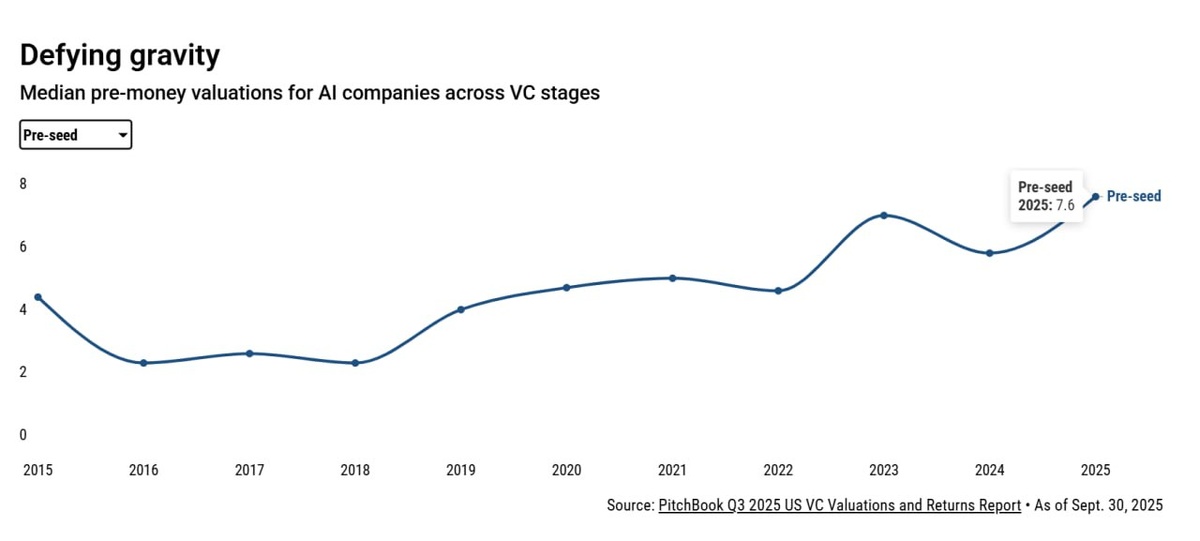 Гравитации не существует. Зато пузырь есть Недавно PitchBook выпустил материал с разбором AI-пузыря. Один график мне понравился особенно сильно — "Defying gravity". И, собственно, это всё, что нужно знать об AI-секторе — он улетает в стратосферу. Пока весь венчурный рынок существует в режиме жёсткой коррекции и урезает мультипликаторы (вспомним пример Flylane), AI-компании просто игнорируют окружающий мир, а оценки в этом сегменте напрочь забыли о существовании гравитации. Давайте посмотрим, что вообще происходит с оценками стартапов на ранних стадиях. 🟢 Pre-seed: Ставка на команду и уникальность Сегодня сильные AI-команды, которые показывают уникальное преимущество, могут получить оценку $6–10М даже при минимальной выручке. Тактика: доказываем, что команда может решить проблему, которую не решит простое использование готовых API. Инвесторы вкладывают в гипотезу и команду. 🟢 Seed: Защита от API-пузыря На Seed-стадии рынок становится очень избирательным. Рост оценок здесь есть