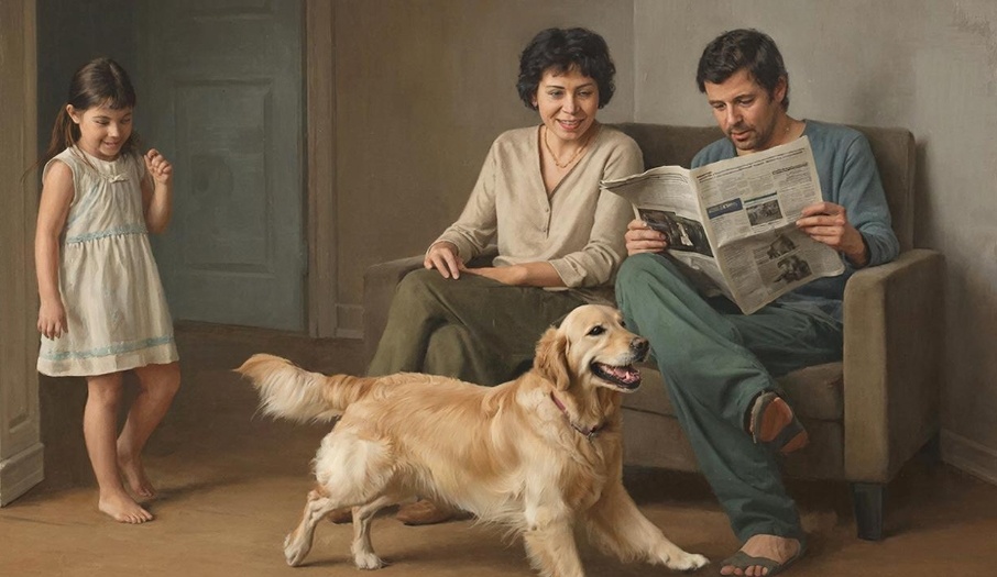 Женщина с добрым лицом и мужчина, читающий газету. И собака, золотистый ретривер, точь в точь как этот, прыгающий вокруг юной девушки в легком платье. Девушки с её лицом.