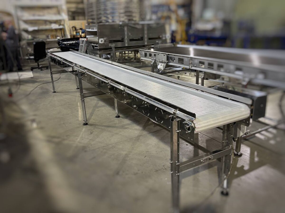 🚀 Проект «Конвейер за 5 дней» Для предприятия птицеводческой отрасли мы изготовили наклонный конвейер для транспортировки продукции на участке переработки. Конвейер длиной 5 м и шириной ленты 500 мм выполнен из нержавеющей стали AISI 430 и 201 с элементами из полиэтилена PE и крепежом A2. В качестве рабочей поверхности использована модульная лента ML2541 (POM/PBT) — износостойкая, устойчивая к влаге и легко очищаемая. 📌 Основные параметры: • длина — 5000 мм • ширина — 500 мм • скорость — 21 м/мин • угол наклона — до 12,5° • нагрузка — до 91 кг • привод — мотор-редуктор СПБелт IP55 с боковым креплением • регулируемая высота — 550–990 мм Конструкция рассчитана на работу в условиях повышенной влажности и температурных перепадов. Опоры регулируются по длине, а ограждения и кожухи защищают привод и узлы от загрязнений. Производство, сборка и отгрузка заняли всего 5 рабочих дней — конвейер полностью готов к установке и подключению на производстве.