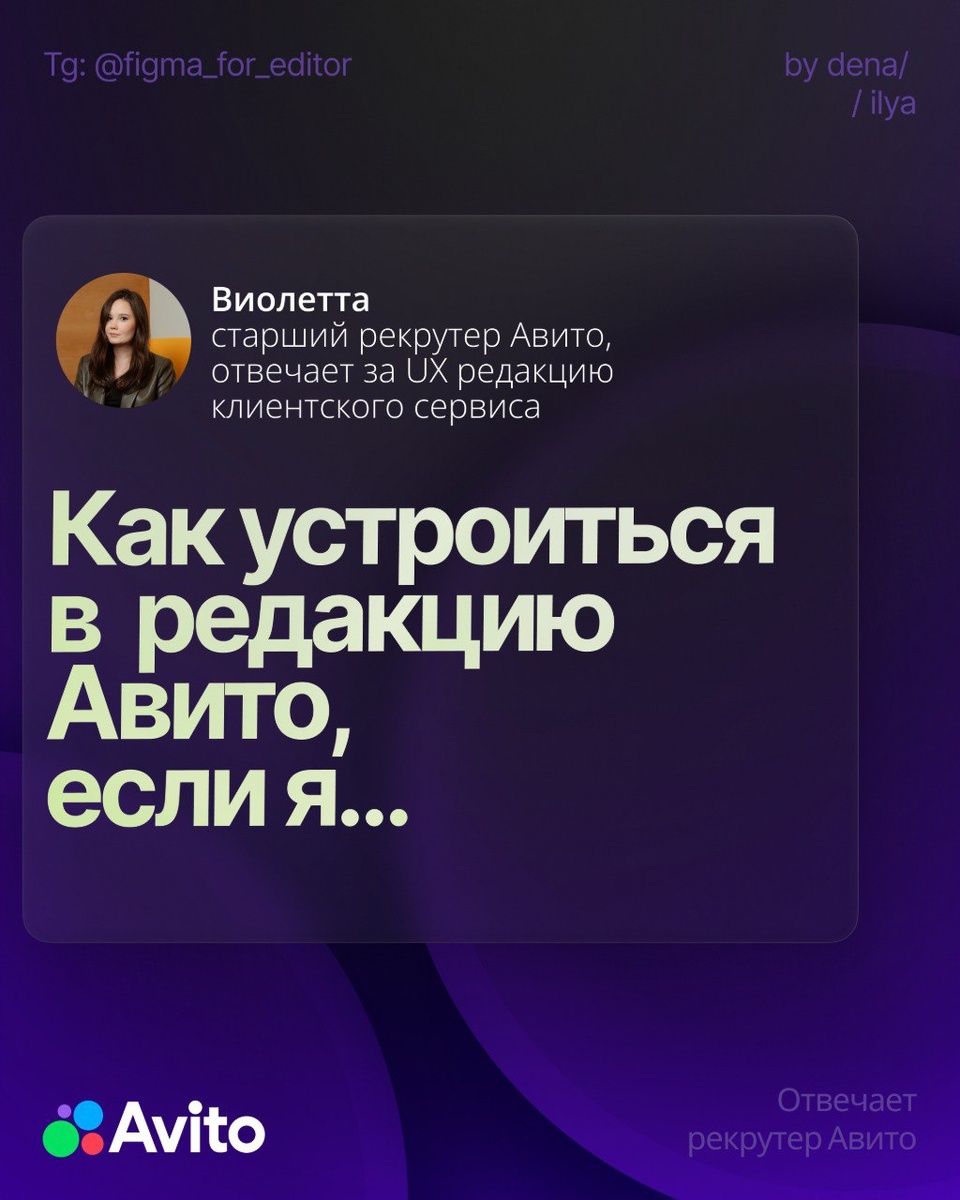 🚪 Как устроиться в редакцию клиентского сервиса в Авито Виолетта — старший рекрутер Авито, который занимается подбором в команды клиентского сервиса, модерации и коммерческого департамента. UX редакция клиентского сервиса — одна из основных команд, в которых она лидирует процесс найма. От Виолетты: В Авито есть две UX редакции - клиентского сервиса и продуктовая редакция. В чем основное отличие - в клиентском сервисе мы не работаем с пользовательскими интерфейсами в привычном понимании, у нас фокус на работу с ботами, пользовательскими сценариями, с админкой сотрудников поддержки, виджетами для них. Виолетта рассказала, как устроиться в Авито с разным опытом и каким путём пойти, если не подходите в команду. А в конце дала советы, как выделиться среди других кандидатов. Пишите в комментариях компании, к нанимающим людям из которых нам стоит сходить. А ещё можете помочь с вопросами, которые им задать 👇 #эксперты