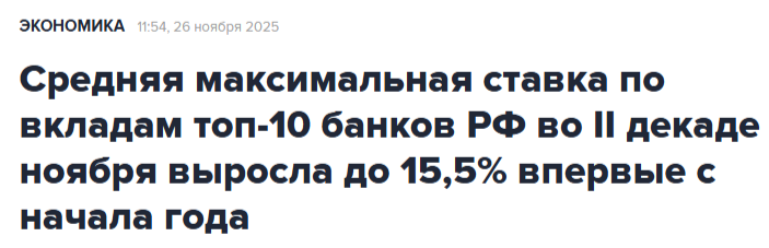 Во вторую декаду ноября впервые в 2025 году наблюдался небольшой рост ставок по банковским вкладам, что следует из динамики средней максимальной ставки в ТОП-10 банков, публикуемой ЦБ. До этого каждые 10 дней ставка или снижалась, или, в редких случаях, практически оставалась на одном уровне. Рост, конечно, лишь примерно на 0,2 п.п., но этот рост нивелировал снижение четырех предшествующих декад (ранее ставки опускались на такой же уровень более чем за 40 дней!). Такой рост обусловлен заметным повышением ставок по среднесрочным депозитам на самые популярные сроки - от трех до шести месяцев. По таким вкладам за последнюю декаду ставки выросли сразу на 0,34 п.п., аналогичным рост оказался и за последние 3 месяца. Как можно заметить, ставки начали расти без какого-либо изменения в денежно-кредитной политике Центробанка: у него в ноябре не было и не планируется заседания по ключевой ставке. И сейчас ставки по вкладам на 3-6 месяцев при ставке ЦБ 16,5% на 0,34 п.п. выше, чем они были 3 меся
