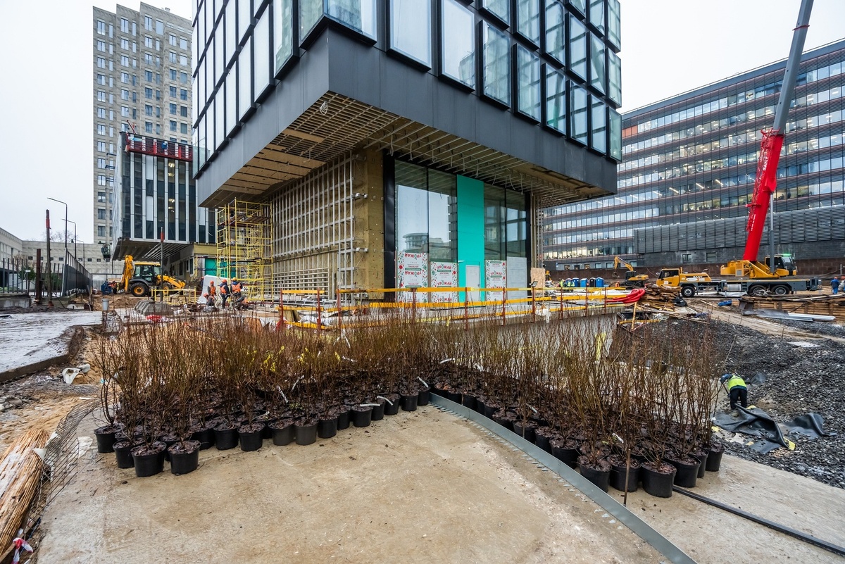 «Квартал состоит из шести жилых и одного офисного корпусов высотой от 11 до 23 этажей, а также инфраструктурного центра и частной школы. Внутренний двор занимает 1,8 гектара. В рамках благоустройства здесь начали создавать сложный ландшафт детской площадки с перепадом высот до трех метров, она займет 1,1 тысячи квадратных метров. Сейчас готовится основание под фундамент и разноуровневые холмы для горок и лазательных систем. В качестве покрытия будут использоваться морская галька, речной песок и резиновая крошка», — отметил Антон Слободчиков.