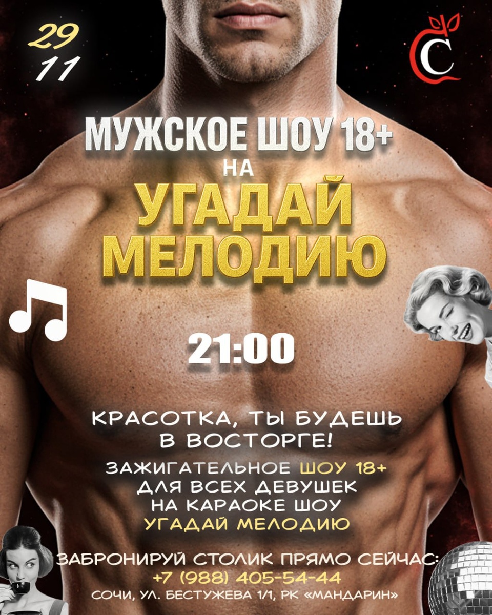 МУЖСКОЕ ШОУ 18+ И КАРАОКЕ ШОУ УГАДАЙ МЕЛОДИЮ 🤍 📅 29.11 суббота | 🕙 Начало в 21:00 🤍🤍🤍🤍 Дорогие, мы подготовили зажигательное шоу 18+ для всех девушек, которое пройдет на вашем любимом караоке шоу Угадай Мелодию! 😍 Вы тоже чувствуете, что ноябрь выкачивает последние силы? Так вот… мы нашли способ перезагрузиться 👀😜 Представьте: суббота, любимый сидр, девичий смех, вкусные блюда - и атмосфера, в которой можно наконец-то отключить голову. Такое точно нельзя пропустить! 🤍 Если надоели серые будни - готовьтесь. Нам будет жарко 🔥 Вы сами прекрасно знаете, места ограничены - столики разбирают быстрее, чем ты успеешь ахнуть 😄 Бронь: ➡️+7 (988) 405-54-44 🤍Сочи, ул. Бестужева 1/1, РК «Мандарин» 🤍По вопросам сотрудничества: @oleg_groom